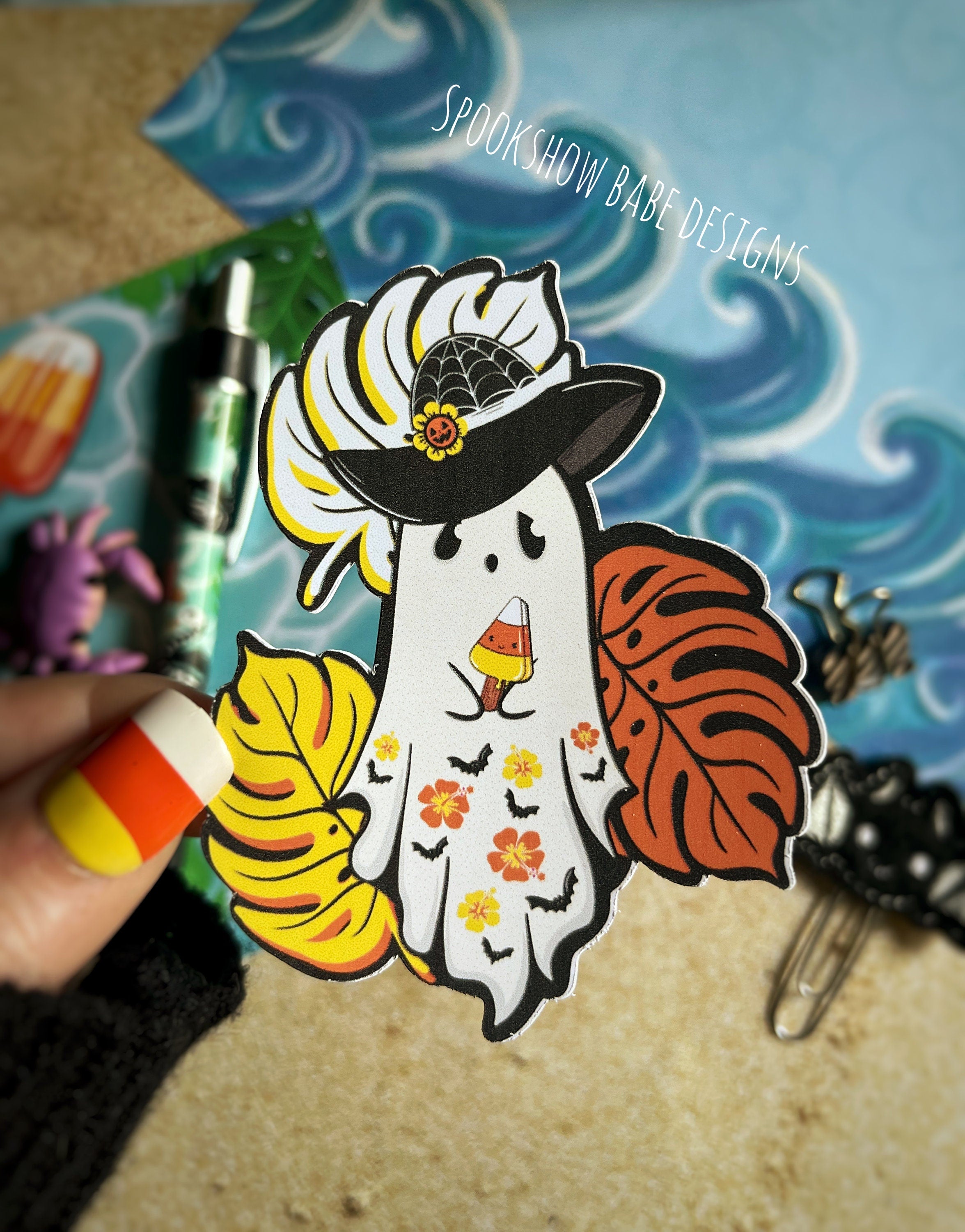 My digital illustration featuring this spooky cute tropical ghostie enjoying a candy corn Popsicle is a super fun way to add some summerween vibes to your planner or craft projects this season!