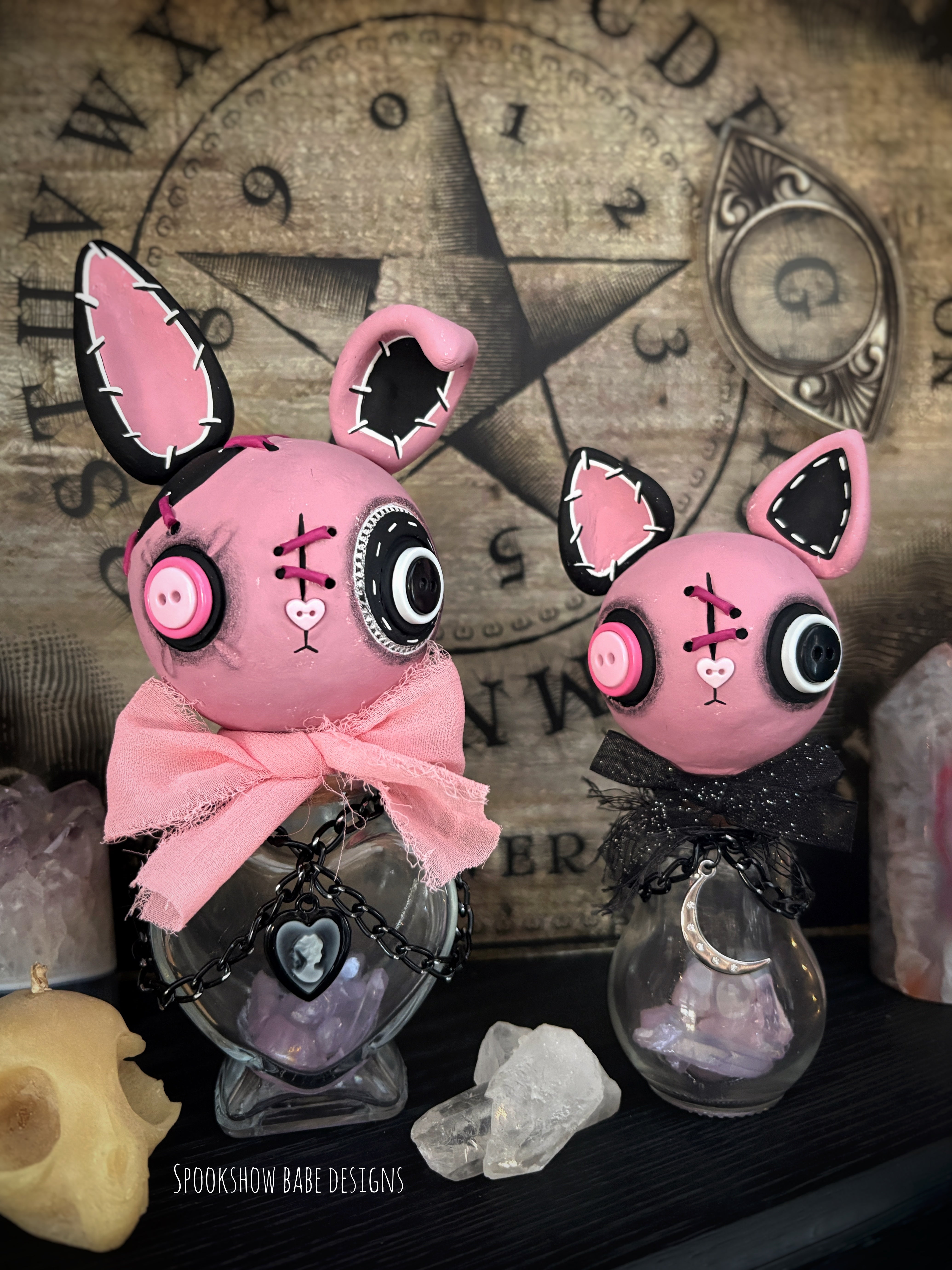 Add a touch of creepy cute whimsy to your home and heart with this handmade Gothic Bunny Trinket Jar! This stitched up Bunny brings a delightfully spooky twist to your home decor with unique gothic hand painted details in dark and moody colors. His button eyes and nose give this jar a playful yet eerie vibe. The chains, a bow and gothic charm on this glass jar makes it feel edgy and mysterious!