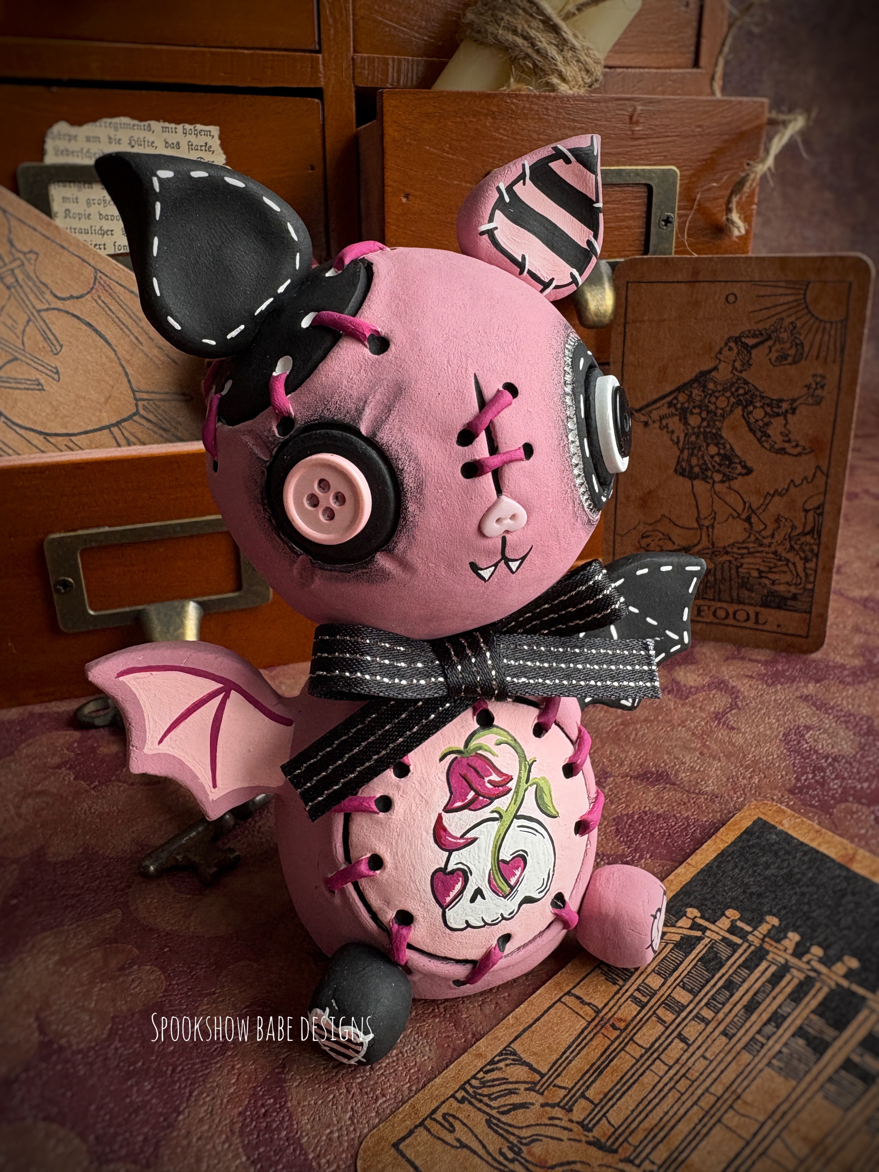 Add a touch of creepy cute whimsy to your home and heart with this handmade Gothic Valentine Bat doll! This stitched up Bat brings a delightfully spooky twist to your home decor with unique gothic hand painted details in dark and moody colors. With his button eyes and nose and a playful yet eerie vibe, this little Bat is sure to bring a weary but whimsical vibe to your Valentines Decor!