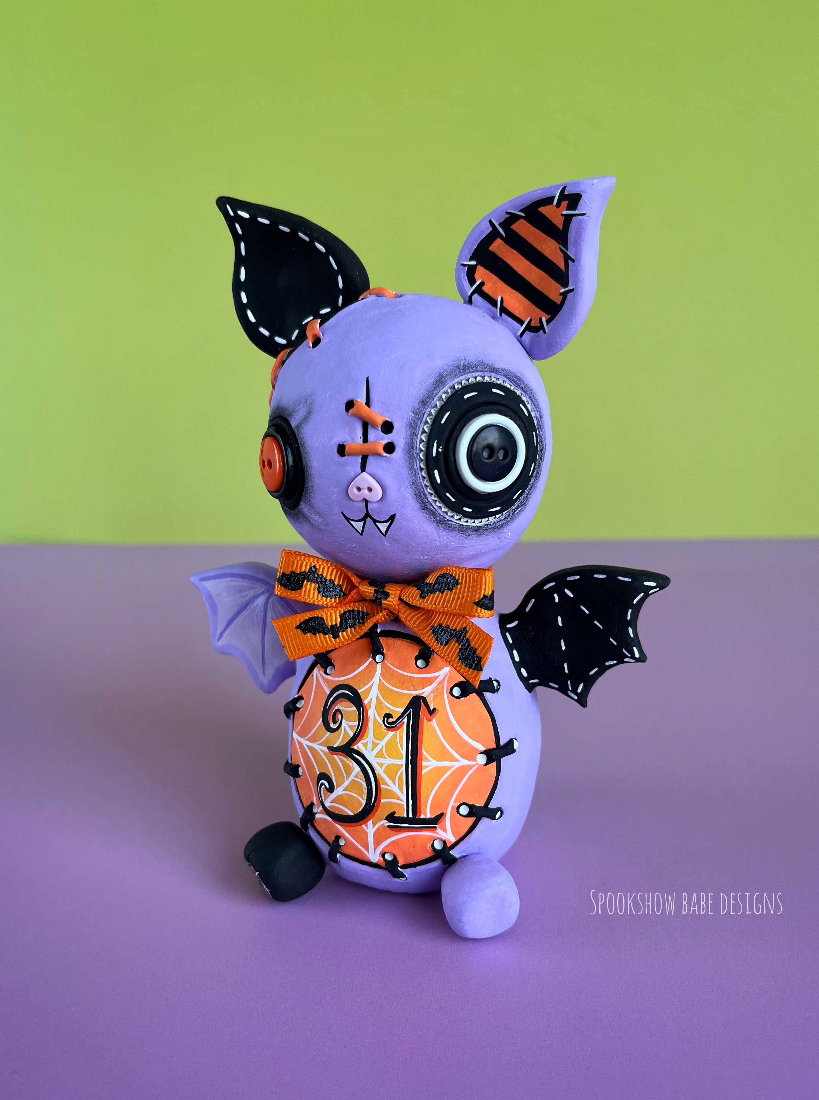 Add a touch of creepy cute whimsy to your home decor with this handmade Halloween Stitched Bat doll! This stitched up Bat brings a delightfully spooky twist to your home decor with unique gothic hand painted details and classic Halloween colors. With his button eyes and nose and a playful yet eerie vibe, this little Bat is sure to bring a smile to your face this spooky spring season or all year!