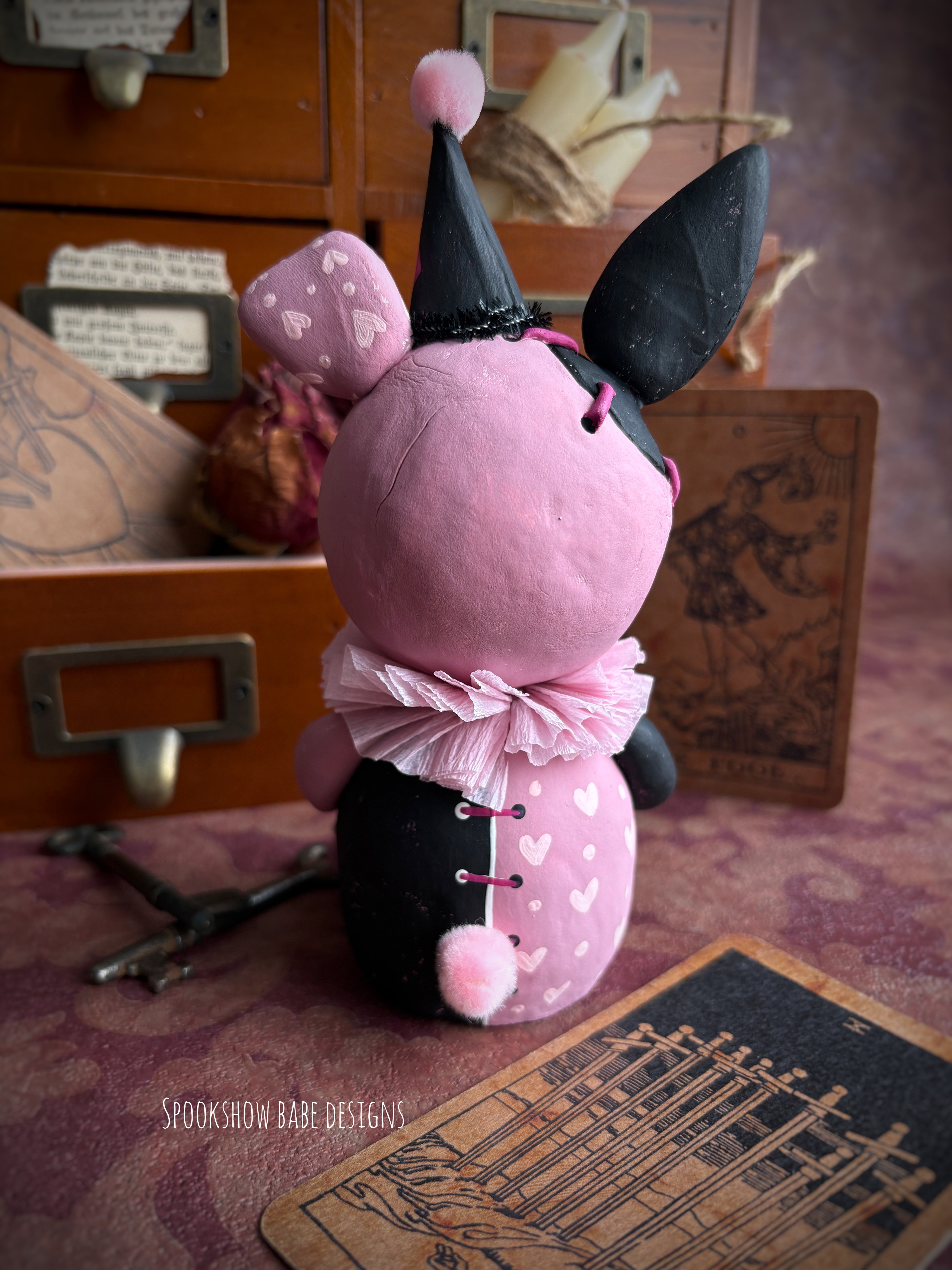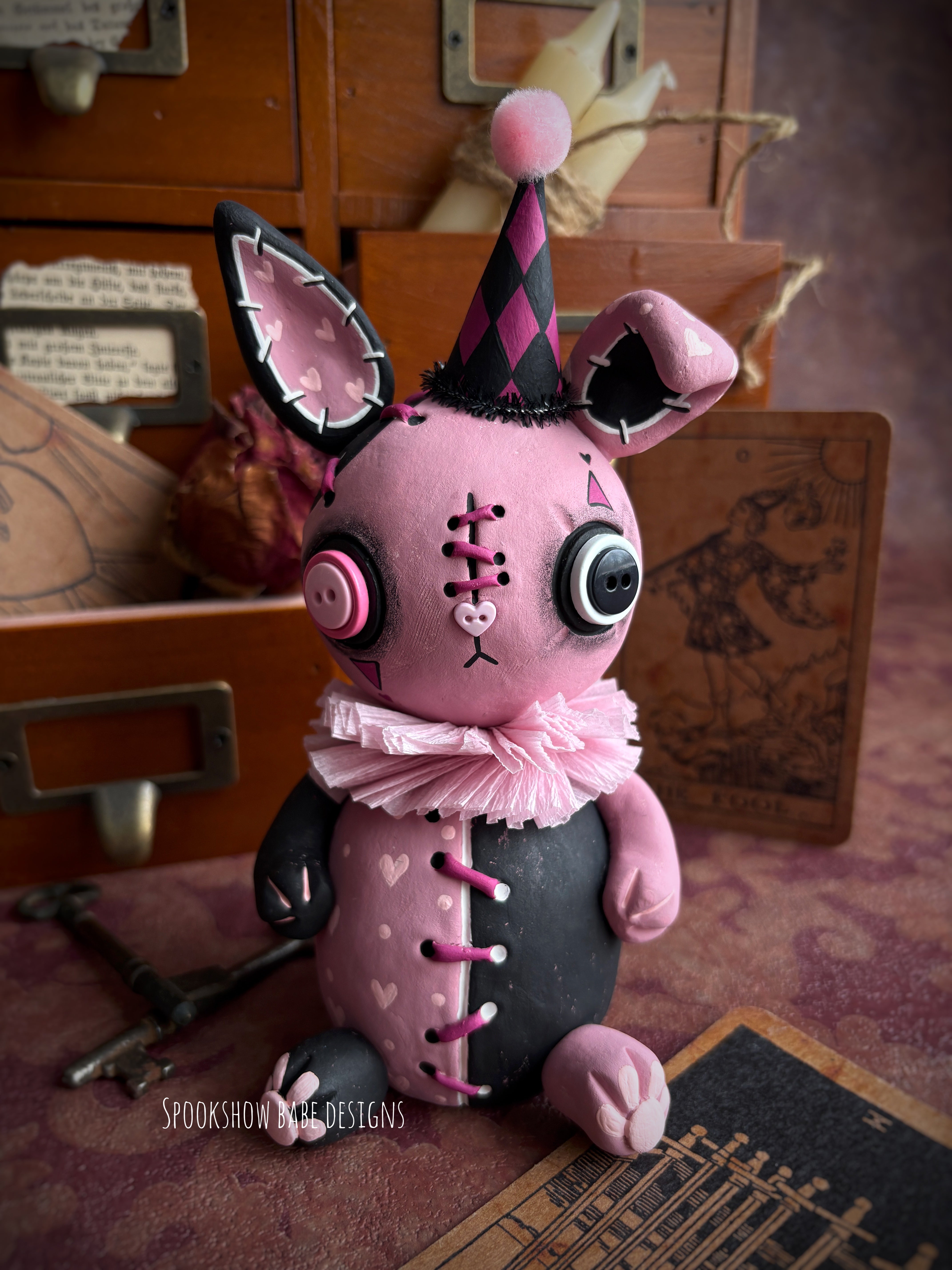Add a touch of creepy cute whimsy to your home and heart with this handmade Gothic Valentine Bunny Clown doll! This stitched up Bunny brings a delightfully spooky twist to your home decor with unique gothic hand painted details in dark and moody colors. With his button eyes and nose and a playful yet eerie vibe, this little Bunny is sure to bring a weary but whimsical vibe to your Valentines Decor!