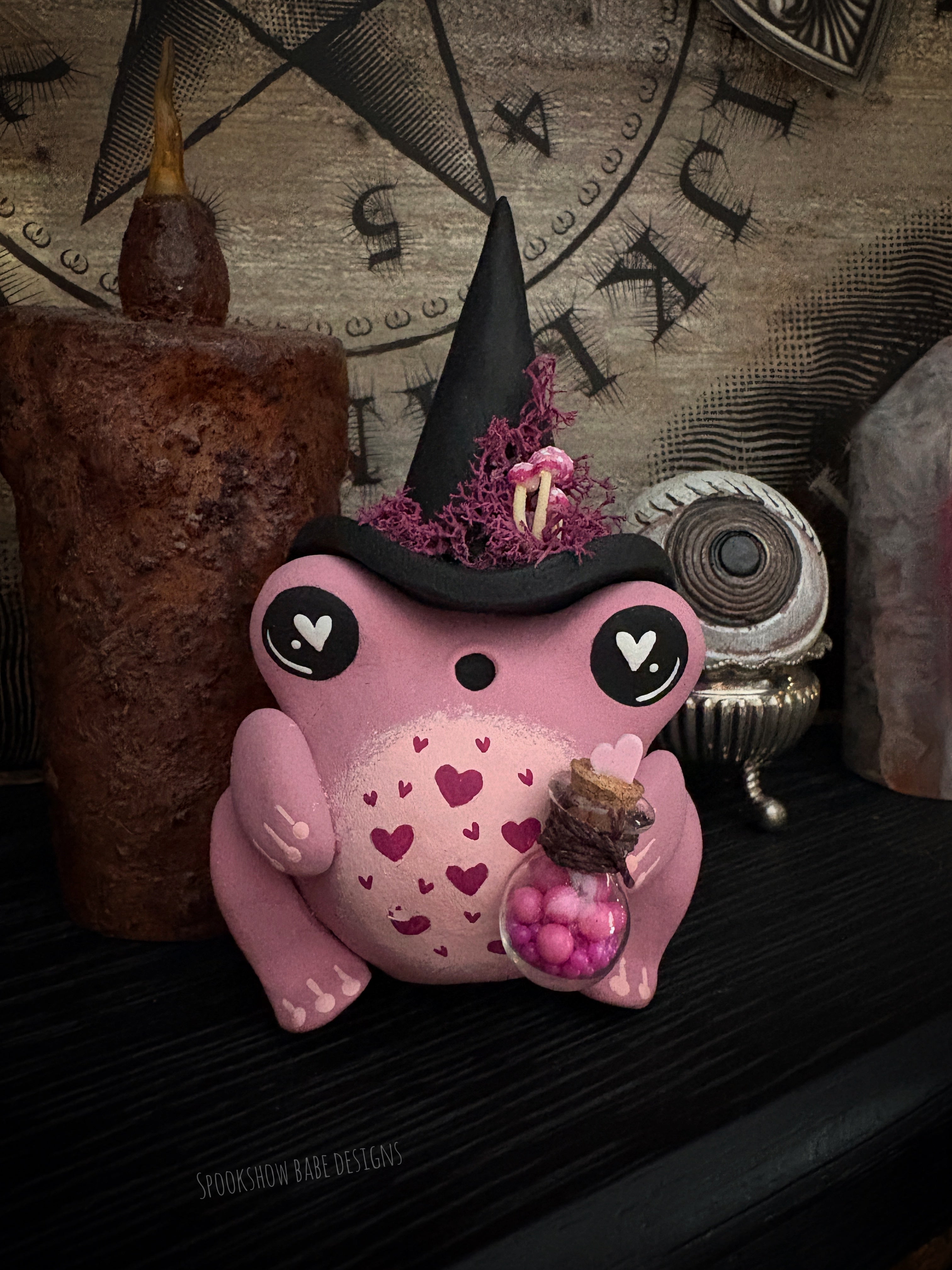 Cottagecore and Goblincore approved! With her tiny bouquet of forest mushrooms growing on her witches hat and her love potion, this little frog has it all!